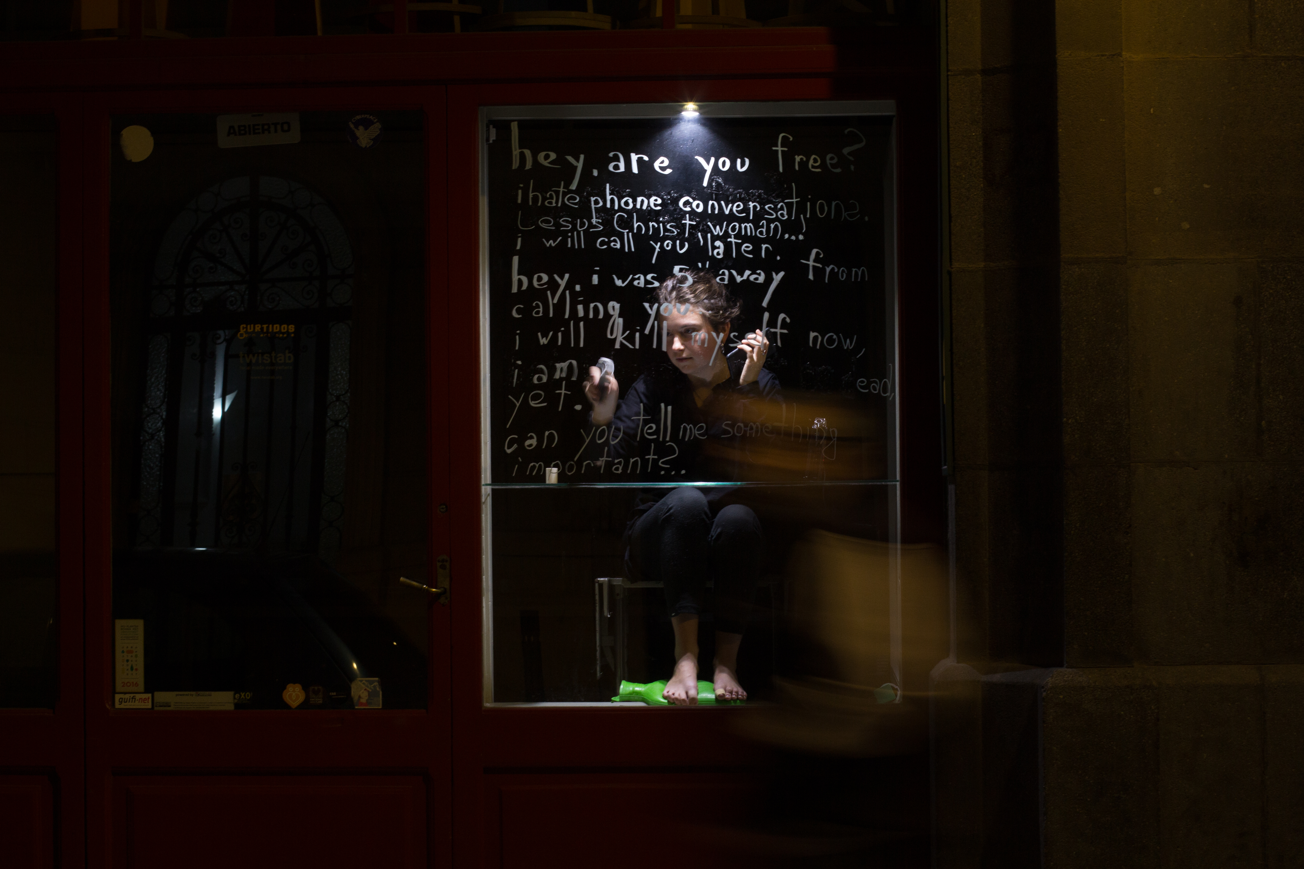 De esta situación de apertura del espacio privado al espacio público, de esta frontera entre lo íntimo y lo colectivo, del encuentro entre lo cotidiano y lo extraordinario nace la convocatoria VITRINAS en 2018, una llamada a artistas locales que investiguen esta frontera. Los artistas eran llamados a investigar la cultura del bien común y los nuevos paradigmas, la naturaleza y la experimentación tecnológica, el arte y el diseño, el individuo y la consciencia social. Valoramos especialmente aquellas propuestas que elaboraron la relación de las vitrinas como fronteras expositivas entre el individuo y el colectivo, el arte y el barrio, lo ordinario y lo extraordinario, lo privado y lo público, generando reflexiones en torno al pensamiento binario y dual. Acostumbrados a pararnos frente a un escaparate movidos por la atracción para consumir algo, aquí las personas eran invitadas a consumir una experiencia, un momento de contemplación estética, una reflexión acaso. Comprendimos que la frontera no era física-espacial, sino de otro orden.